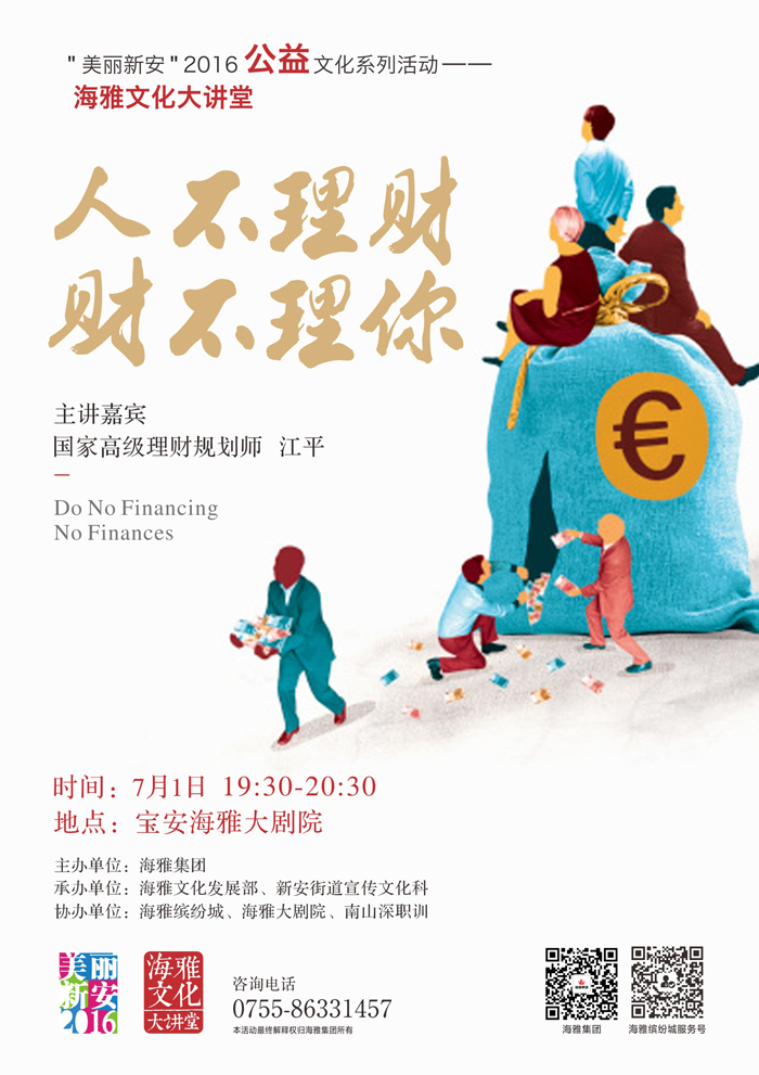 7月1日晚19:30-20:30,宝安海雅大剧院将举办——“人不理财,财不理你”主题公益讲座,主讲嘉宾国家高级理财规划师江平将针对理财的基本原则、途径、投资工具和风险偏好等,结合现实案例进行深入浅出的讲解, 欢迎各位对理财投资感兴趣的朋友参加,更有精美礼品等你来拿!