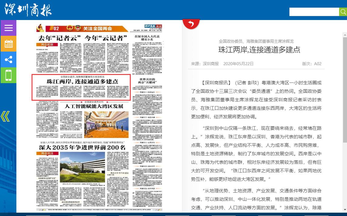 全国政协委员、海雅集团董事局主席涂辉龙在接受深圳商报记者采访时表示,在珠江口加快建设更多通道连接东西两岸,大湾区的生活将更加便利,经济发展将更加协调。