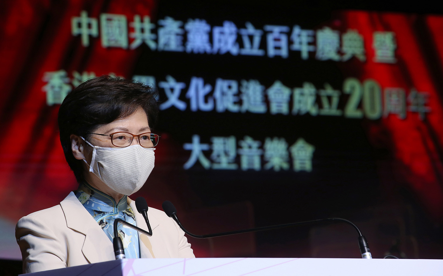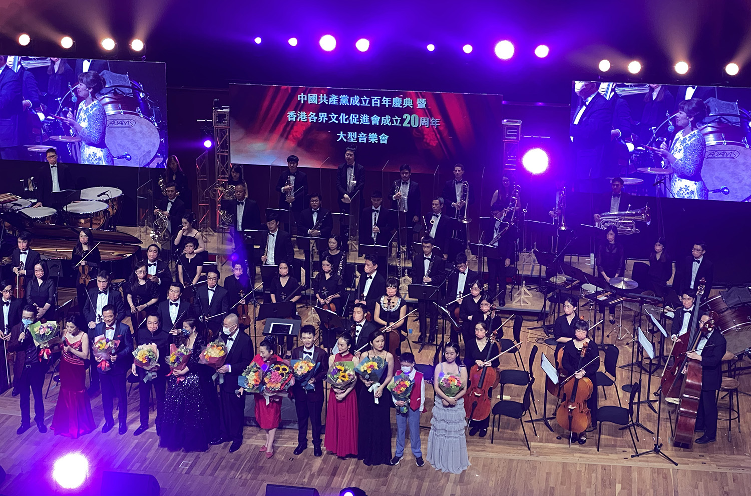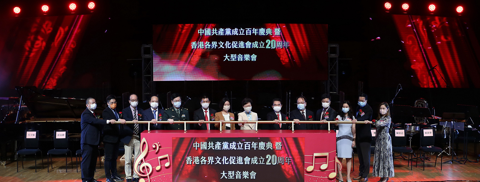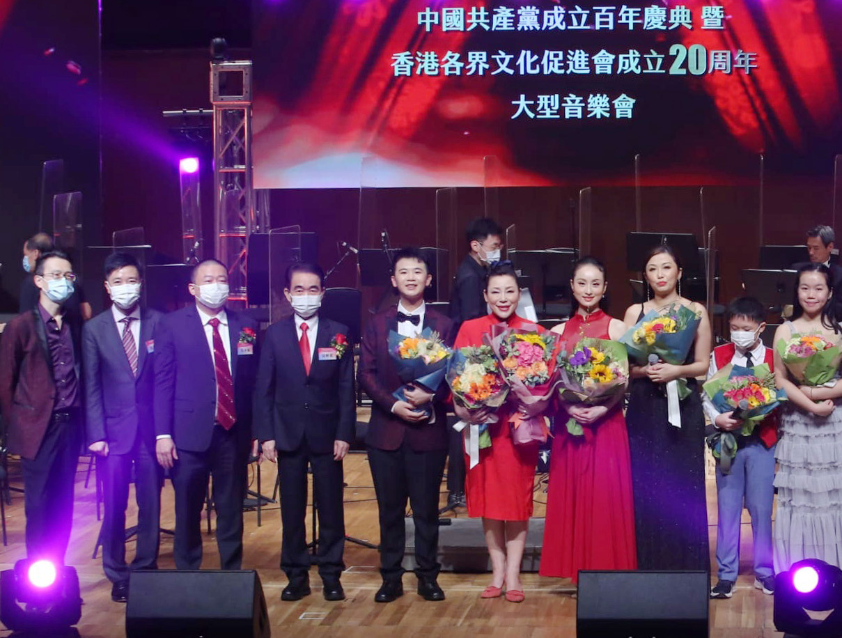 全国政协经济委员会副主任、文促会荣誉会长容永祺,全国政协委员、香港大公文汇传媒集团董事长姜在忠,全国政协委员、文促会荣誉会长苏长荣、孙少文,紫荆杂志社社长杨勇,文促会常务副主席刘娟、文颖怡、马春玲联同香港文化艺术界人士、各友好社团代表及全场近千名观众,在美妙的歌声中,共同庆祝中国共产党百年华诞。