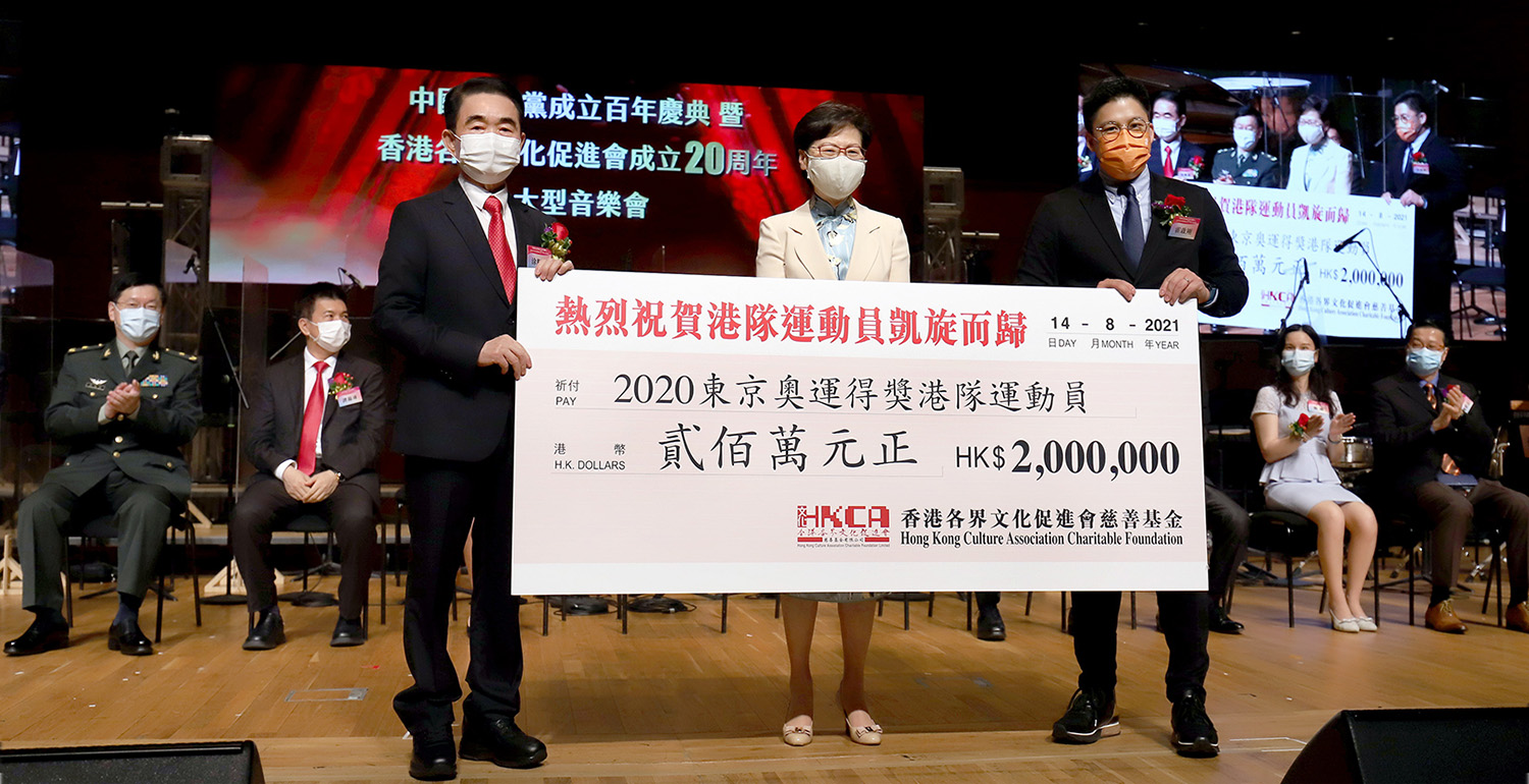 在刚刚闭幕的东京奥运会上,香港奥运代表团积极面对疫情挑战,顽强拼搏、奋勇争先,斩获了1金、2银、3铜共6面奖牌,创下历史最佳战绩。文促会主席涂辉龙在致辞中表示:“奥运健儿的拼搏精神,为香港社会注入强大正能量,鼓舞全港市民团结起来,积极面对挑战,共创美好未来。为此,文促会出资200万元,嘉许在本届奥运会上为国为港争光的运动健儿,激励他们不断突破自我,争取再创佳绩”。仪式上,由行政长官林郑月娥见证,文促会主席涂辉龙致送200万元支票予得奖运动员,港协暨奥委会副会长霍启刚代表运动员接受。